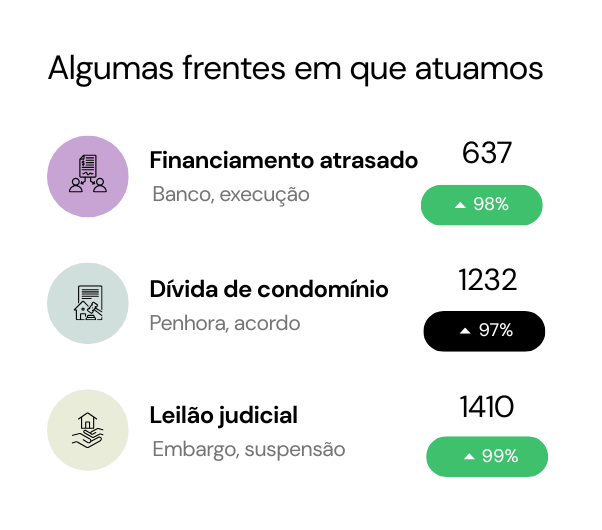 Perder o imóvel da noite para o dia por não ter tomado medidas a tempo não é incomum. Quando seu imóvel é ameaçado, é preciso entrar com embargo + pedido de suspensão imediato, derrubando juros abusivos e virando a negociação a seu favor. Quanto antes você acionar a defesa, maior a probabilidade de manter seu imóvel.